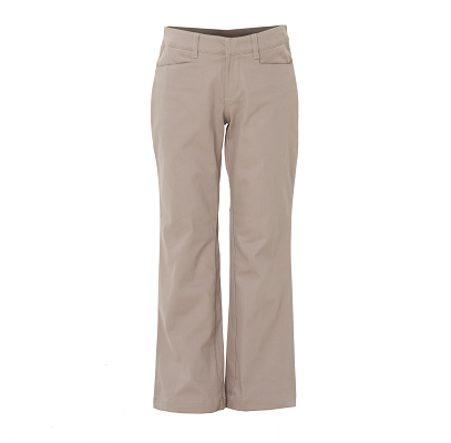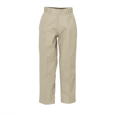 Relaxed fit, plain front pant. Adjustable waistband and double knees in sizes 3-7, 8-16, and husky sizes. Quarter top front pockets, 2 back pockets, hook and eye closure. Wrinkle and stain resistant.
